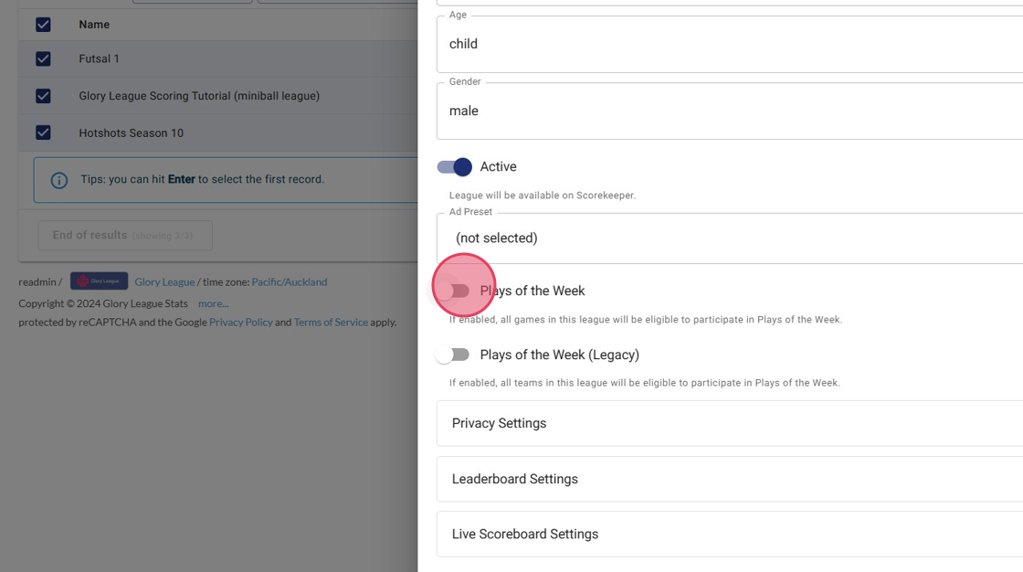 5. Toggle the "Plays of the Week" field on (or off if you wish to switch it off for a league already enabled). Do not use the Plays of the Week (Legacy) option