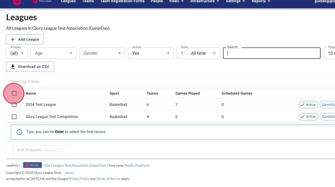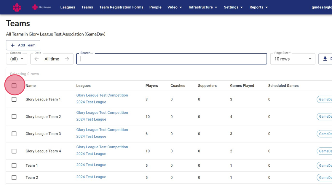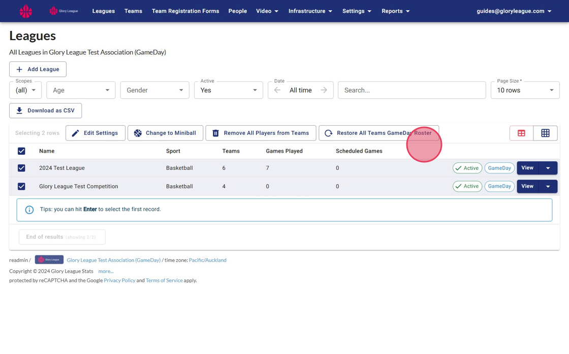 5. You can "Restore the GameDay Roster" in bulk. To do this to all teams, enter the Date criteria, Page Size (default is 10 rows) then click this checkbox.