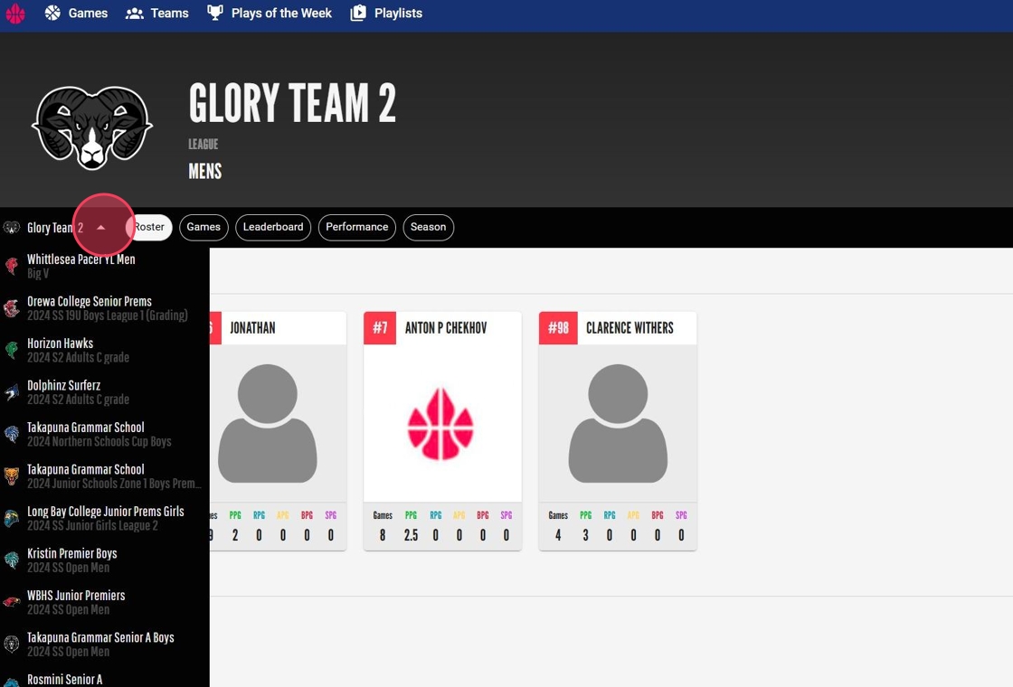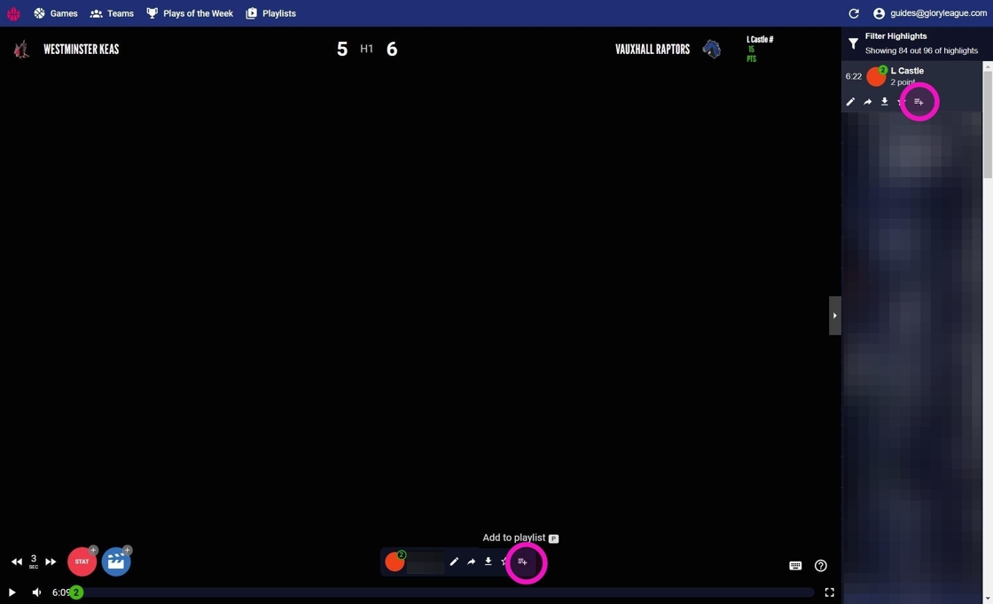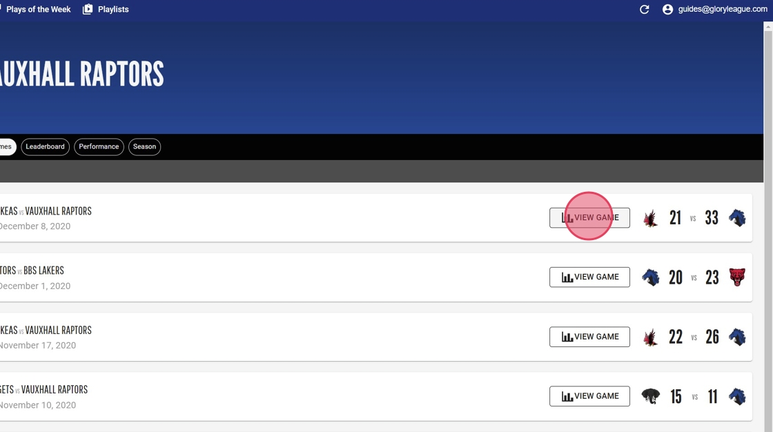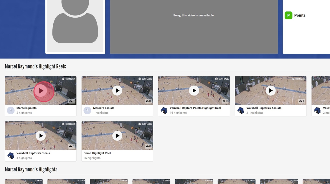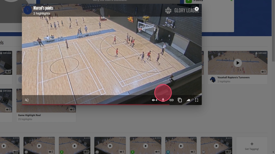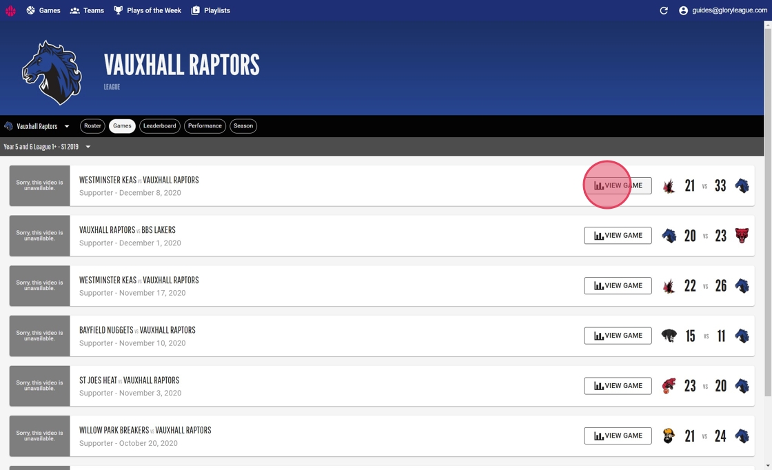 Unfortunately due to privacy reasons Glory League members are only able to view their own videos, if your team did not play in a game you will not be able to see that game in your player portal.